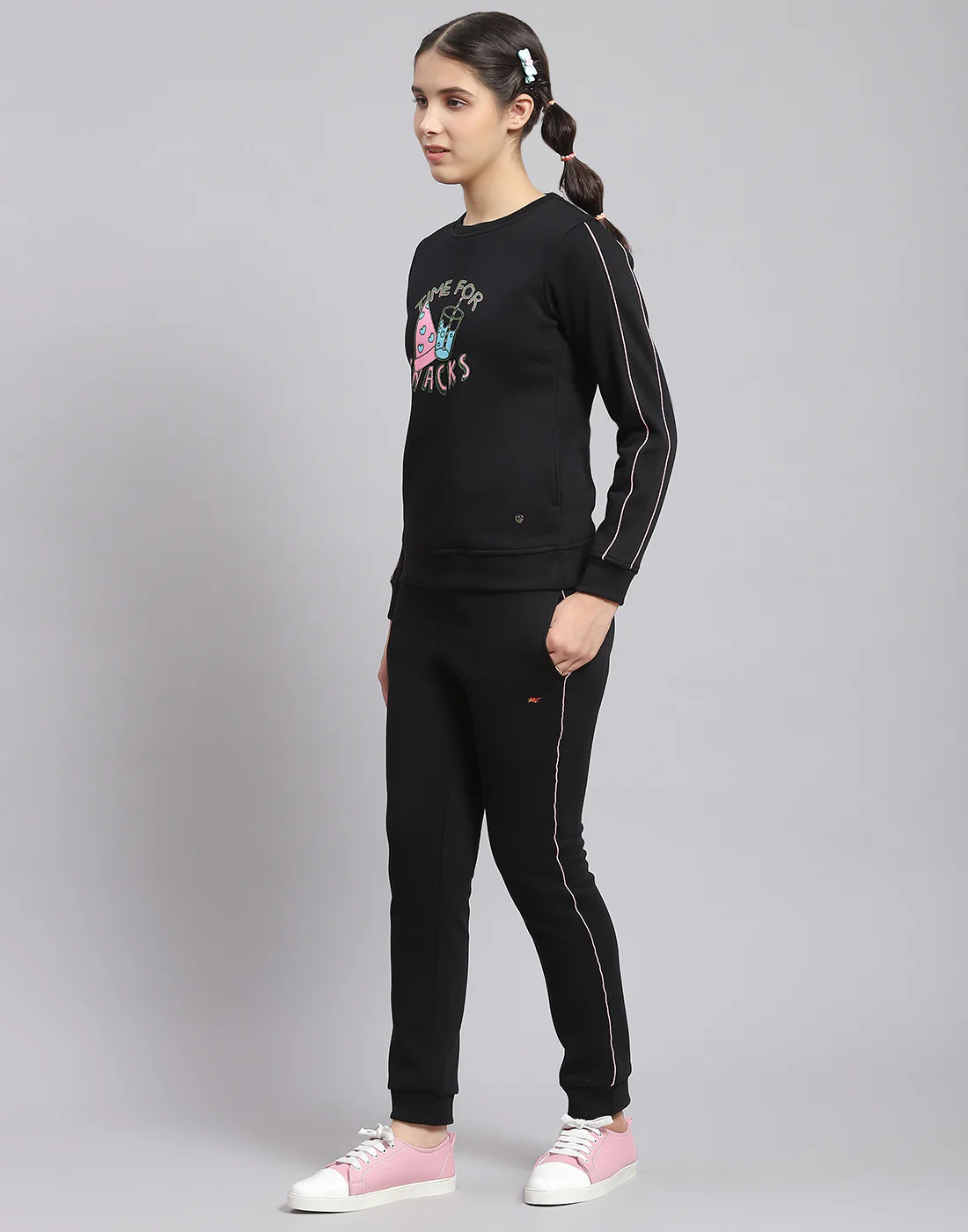 Girls Black Printed Round Neck Full Sleeve Tracksuit