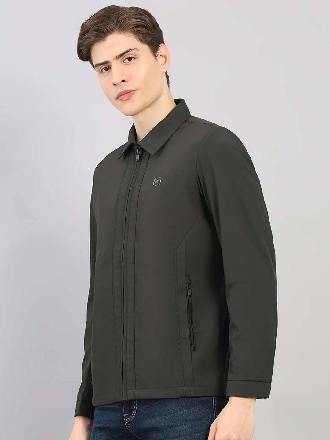 Men Dark Green Solid Stand Collar Full Sleeve Jacket