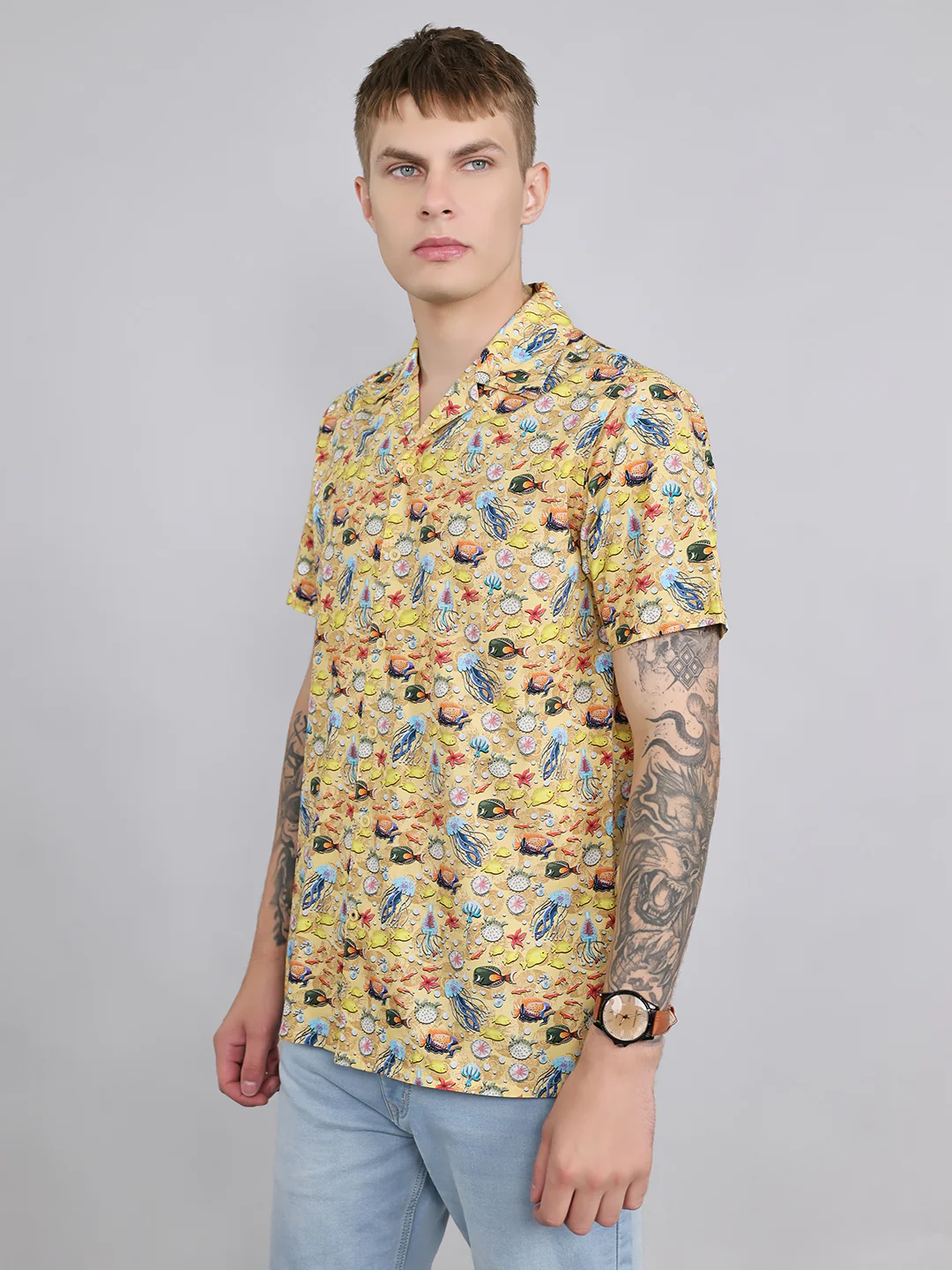 Men Yellow Printed Collar Half Sleeve Shirt