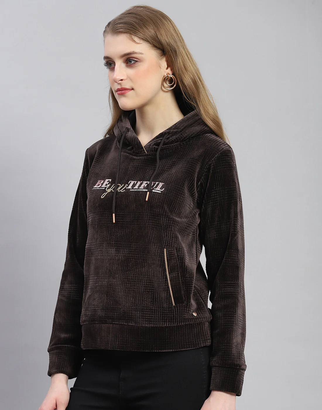 Women Brown Embroidered Hooded Full Sleeve Sweatshirt