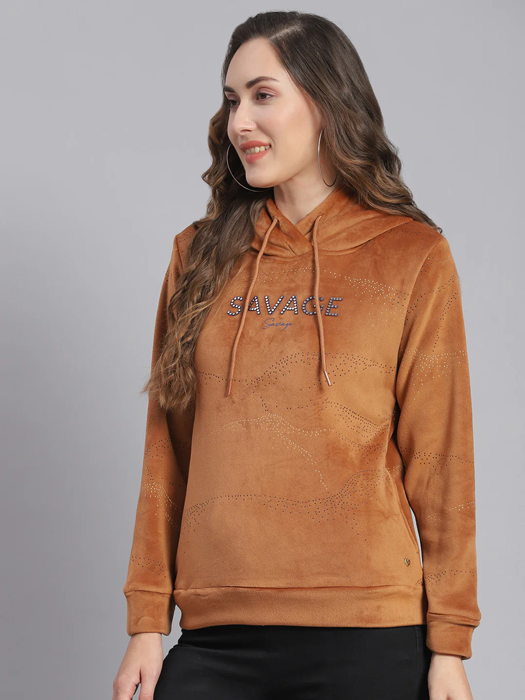 Women Brown Printed Hooded Full Sleeve Sweatshirts
