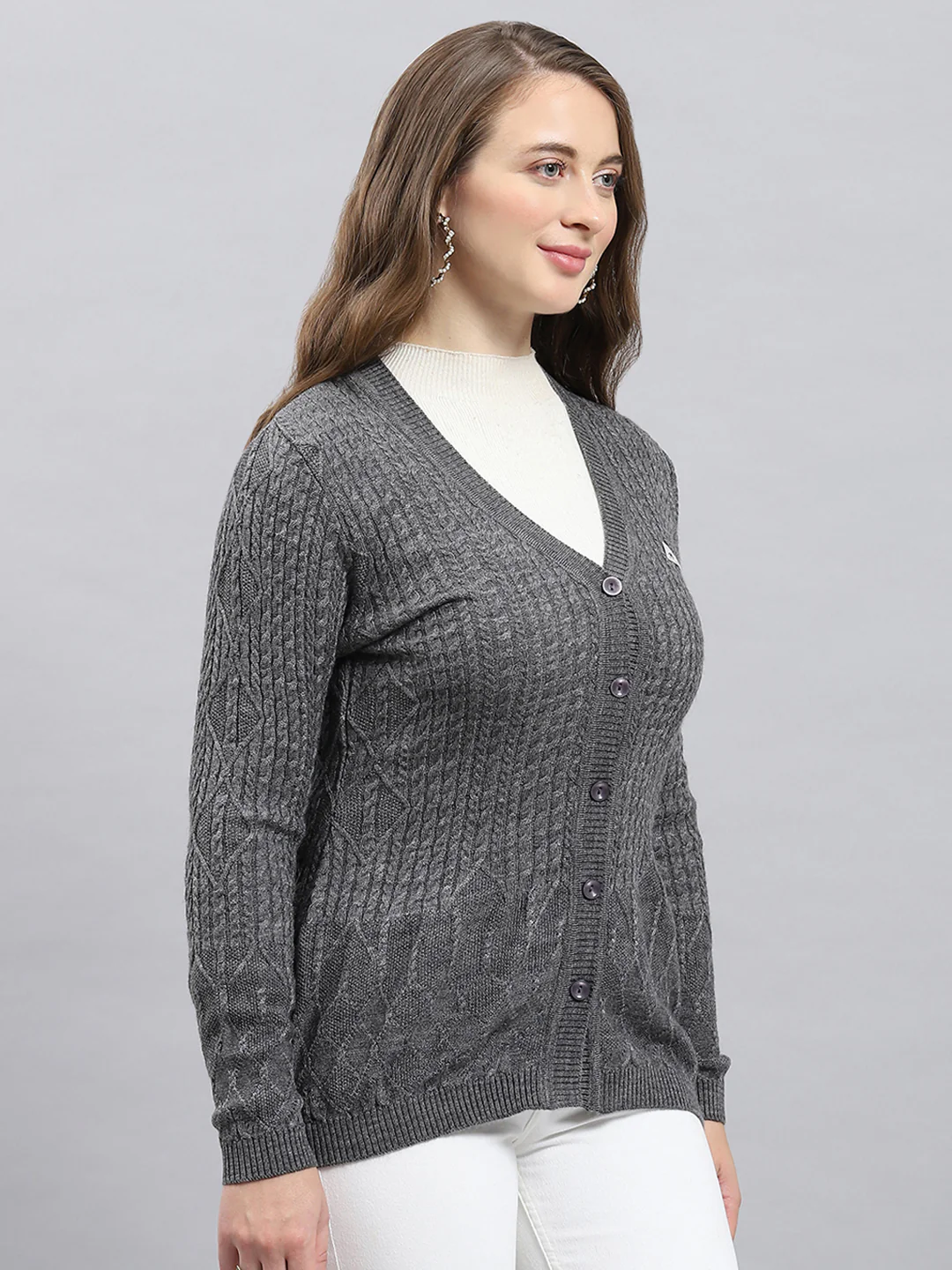 Women Grey Self Design V Neck Full Sleeve Cardigan