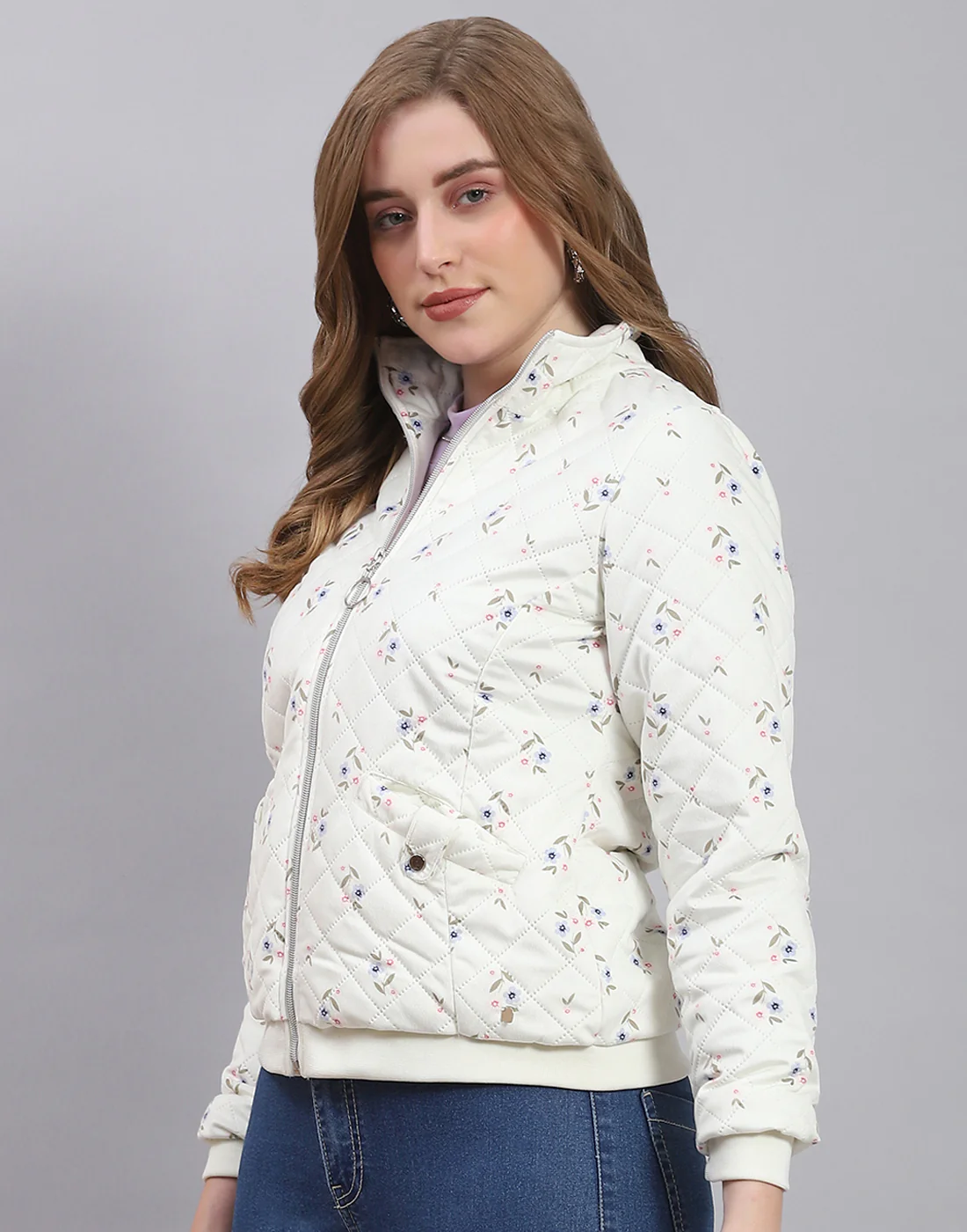 Women Off White Printed Stand Collar Full Sleeve Jacket