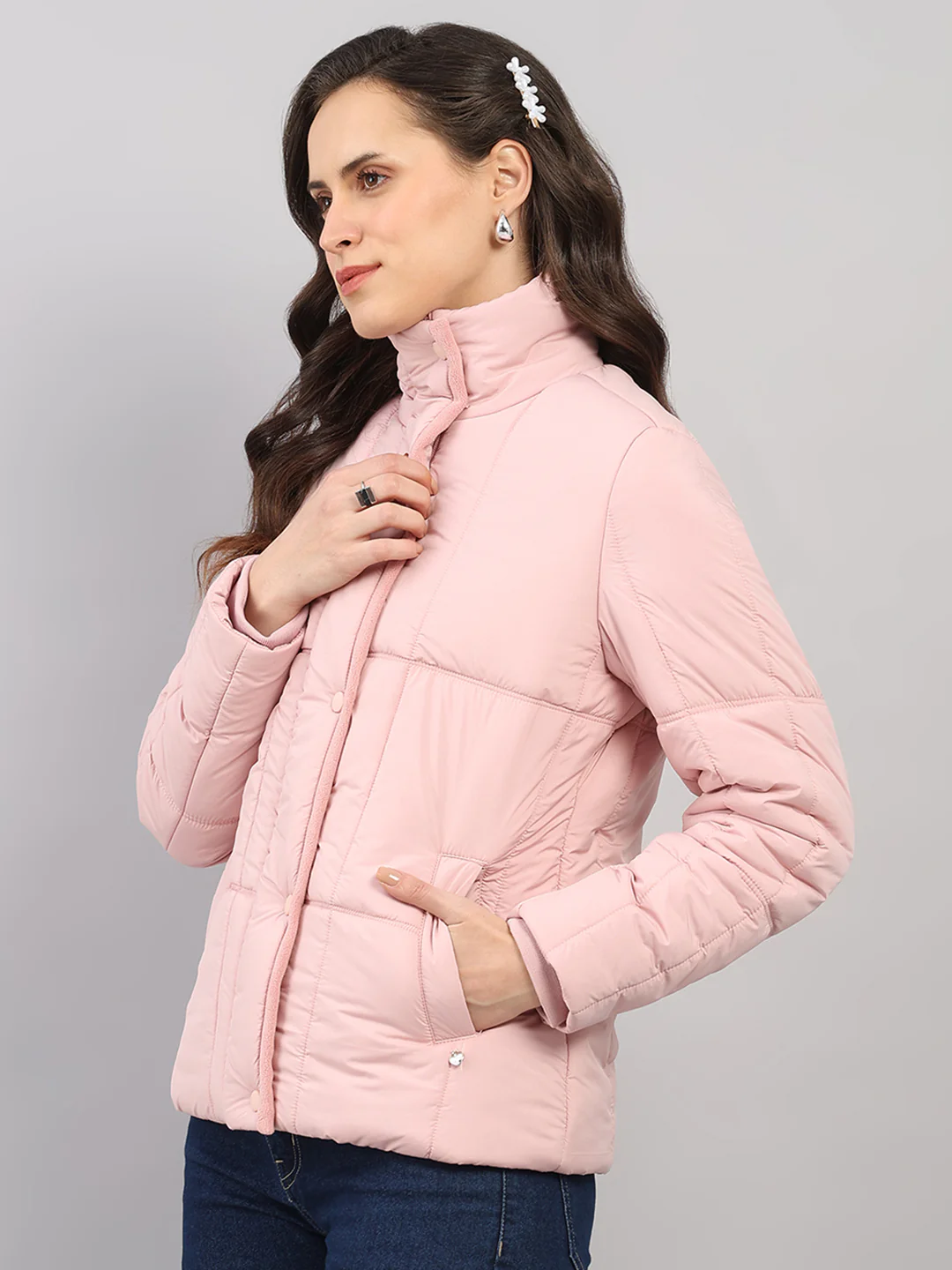 Women Pink Solid High Neck Full Sleeve Jacket